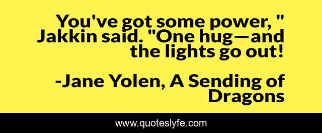This page presents the quote "You've got some power, " Jakkin said. "One hug—and the lights go out!". Author of this quote is Jane Yolen, A Sending of Dragons. This quote is about lights, hug, humor, power,.