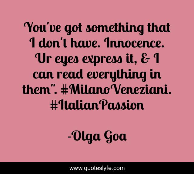 This page presents the quote "You've got something that I don't have. Innocence. Ur eyes express it, & I can read everything in them". #MilanoVeneziani. #ItalianPassion". Author of this quote is Olga Goa. This quote is about italy, english, books, russian-literature, italian-literature, russia, rome, passion, bookworm,.