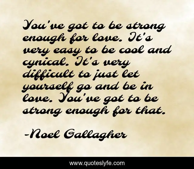 This page presents the quote "You've got to be strong enough for love. It's very easy to be cool and cynical. It's very difficult to just let yourself go and be in love. You've got to be strong enough for that.". Author of this quote is Noel Gallagher. This quote is about strong, love, affection, yourself,.