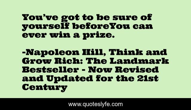 This page presents the quote "You’ve got to be sure of yourself beforeYou can ever win a prize.". Author of this quote is Napoleon Hill, Think and Grow Rich: The Landmark Bestseller - Now Revised and Updated for the 21st Century. This quote is about confidence, success, certainty, winning, inspirational, enthusiasm, self-esteem,.