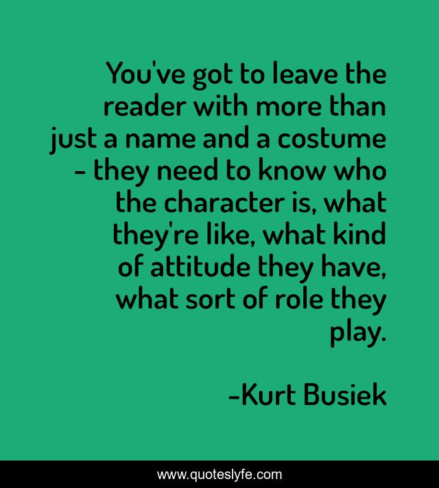 This page presents the quote "You've got to leave the reader with more than just a name and a costume - they need to know who the character is, what they're like, what kind of attitude they have, what sort of role they play.". Author of this quote is Kurt Busiek. This quote is about character, name,.