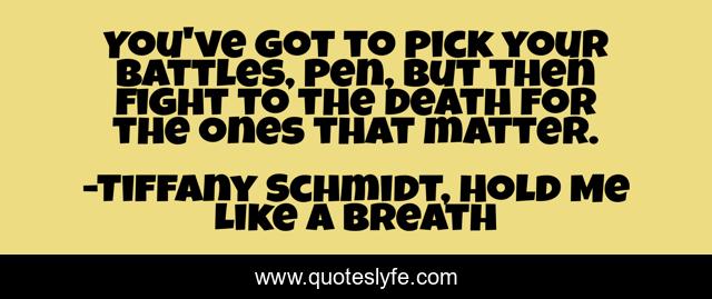 This page presents the quote "You've got to pick your battles, Pen, but then fight to the death for the ones that matter.". Author of this quote is Tiffany Schmidt, Hold Me Like a Breath. This quote is about motivation, don-t-give-up, choose-your-battles-wisely,.