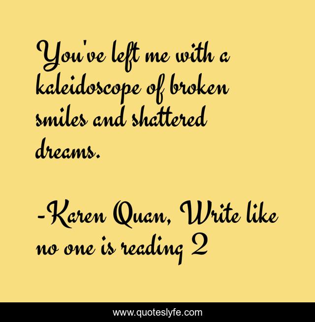 This page presents the quote "You've left me with a kaleidoscope of broken smiles and shattered dreams.". Author of this quote is Karen Quan, Write like no one is reading 2. This quote is about loss, relationship, shattered, quotes, sadness, heartbreak, love-lost, heartbroken, dreams,.