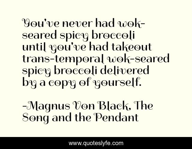 This page presents the quote "You've never had wok-seared spicy broccoli until you've had takeout trans-temporal wok-seared spicy broccoli delivered by a copy of yourself.". Author of this quote is Magnus Von Black, The Song and the Pendant. This quote is about fantasy, time-travel, humor, sci-fi,.