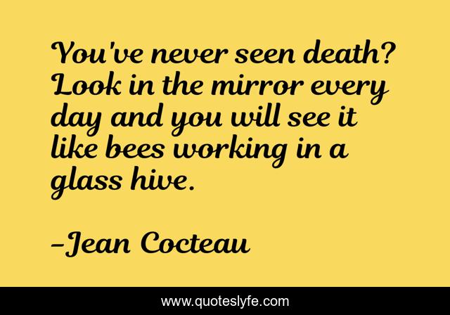 This page presents the quote "You've never seen death? Look in the mirror every day and you will see it like bees working in a glass hive.". Author of this quote is Jean Cocteau. This quote is about glass, day, mirror,.
