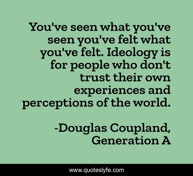 This page presents the quote "You've seen what you've seen you've felt what you've felt. Ideology is for people who don't trust their own experiences and perceptions of the world.". Author of this quote is Douglas Coupland, Generation A. .