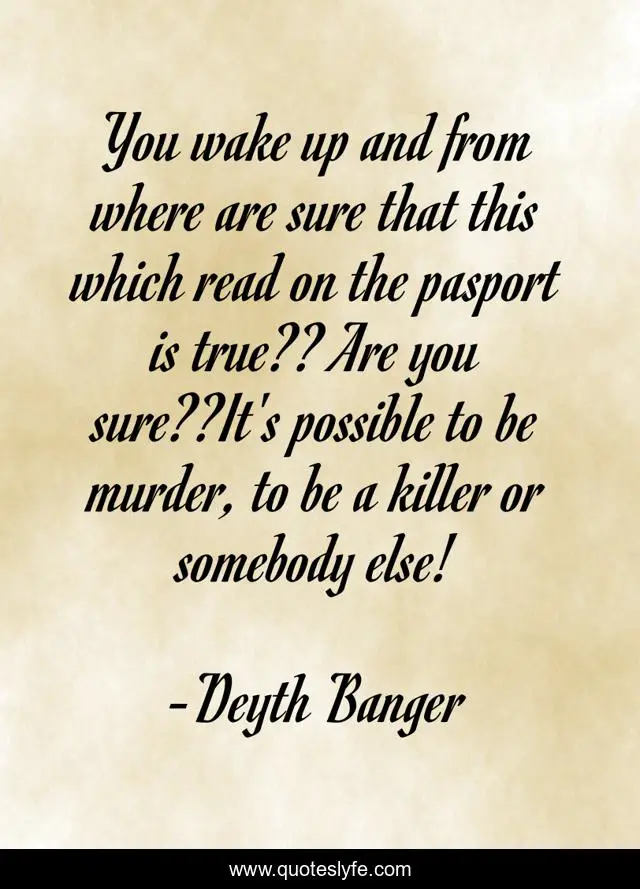This page presents the quote "You wake up and from where are sure that this which read on the pasport is true?? Are you sure??It's possible to be murder, to be a killer or somebody else!". Author of this quote is Deyth Banger. This quote is about murder, from, killer, possible, up, sure, wake, or,.