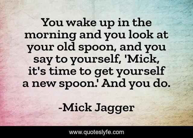 This page presents the quote "You wake up in the morning and you look at your old spoon, and you say to yourself, 'Mick, it's time to get yourself a new spoon.' And you do.". Author of this quote is Mick Jagger. This quote is about wake up, time, yourself,.