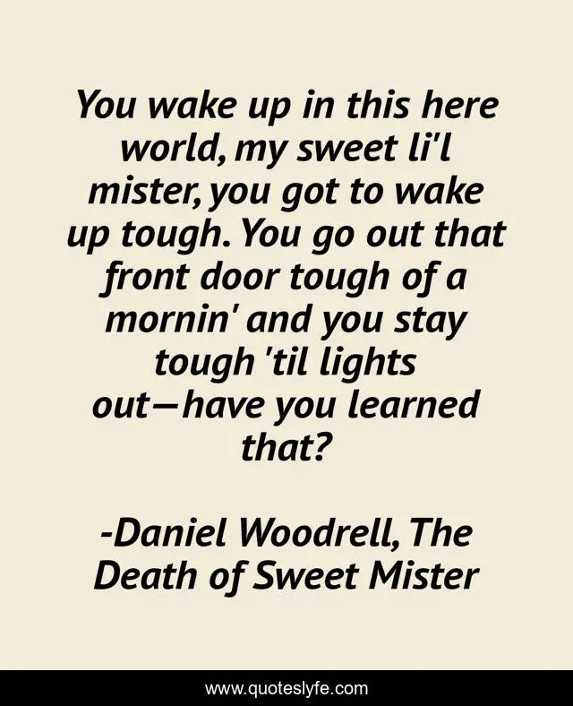 This page presents the quote "You wake up in this here world, my sweet li'l mister, you got to wake up tough. You go out that front door tough of a mornin' and you stay tough 'til lights out—have you learned that?". Author of this quote is Daniel Woodrell, The Death of Sweet Mister. This quote is about strength, toughness,.