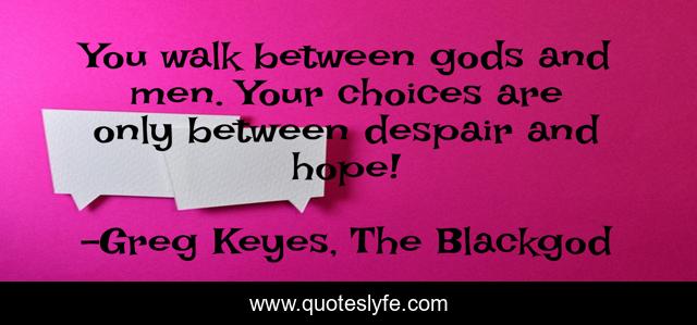 This page presents the quote "You walk between gods and men. Your choices are only between despair and hope!". Author of this quote is Greg Keyes, The Blackgod. This quote is about climax, despair, confrontation, hope,.