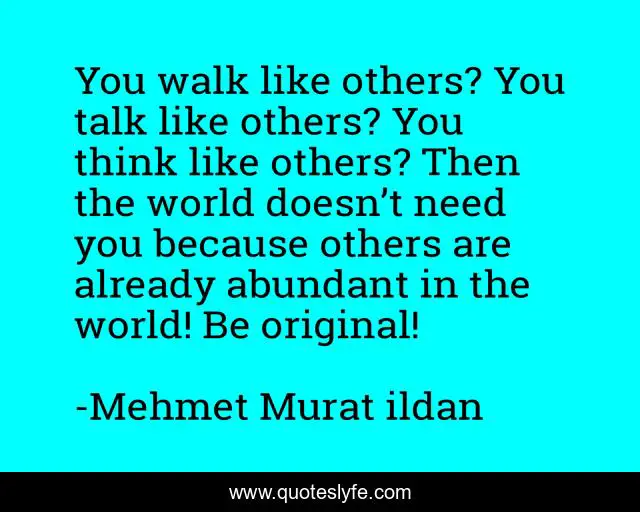 This page presents the quote "You walk like others? You talk like others? You think like others? Then the world doesn’t need you because others are already abundant in the world! Be original!". Author of this quote is Mehmet Murat ildan. This quote is about turkish-aphorisms, abundant, mehmet-murat-ildan, ildan-wise-sayings, turkish, ildan-wisdom, turkish-sayings, turkish-playwrights, uniqueness,.