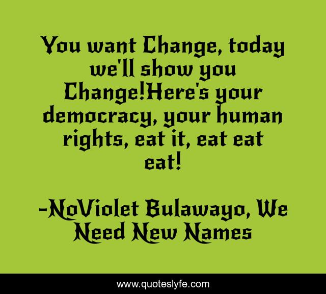 This page presents the quote "You want Change, today we'll show you Change!Here's your democracy, your human rights, eat it, eat eat eat!". Author of this quote is NoViolet Bulawayo, We Need New Names. This quote is about change, human-rights, democracy, dictatorship,.
