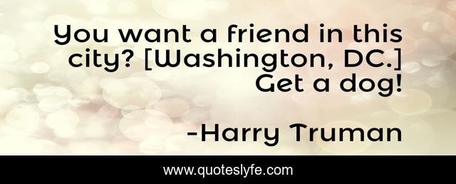 This page presents the quote "You want a friend in this city? [Washington, DC.] Get a dog!". Author of this quote is Harry Truman. This quote is about political-humor, faithfulness, sarcasm, friends, egotism, humor, politics, friendship, dogs,.