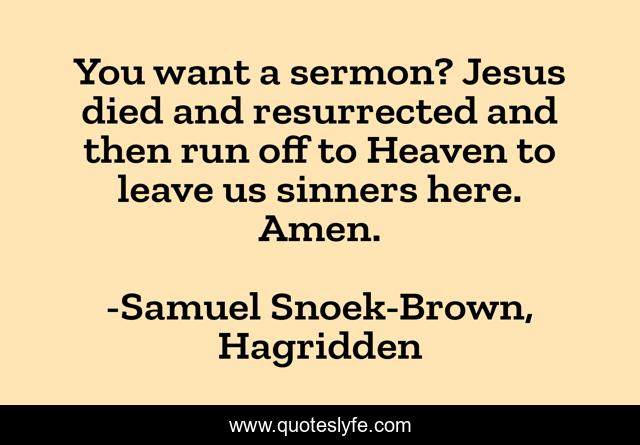 This page presents the quote "You want a sermon? Jesus died and resurrected and then run off to Heaven to leave us sinners here. Amen.". Author of this quote is Samuel Snoek-Brown, Hagridden. This quote is about religion, hagridden, historical-fiction, samuel-snoek-brown,.