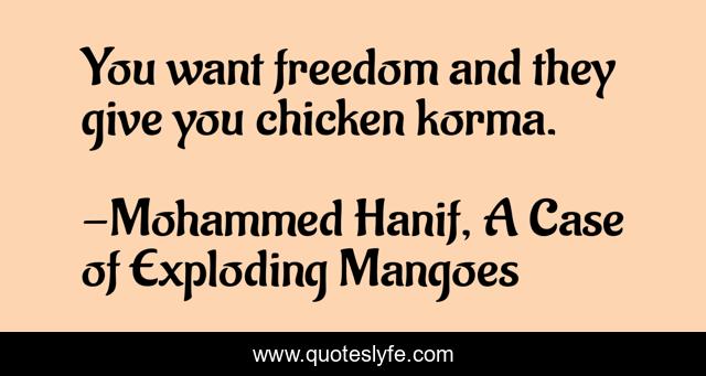 This page presents the quote "You want freedom and they give you chicken korma.". Author of this quote is Mohammed Hanif, A Case of Exploding Mangoes. This quote is about freedom, enprisonment,.