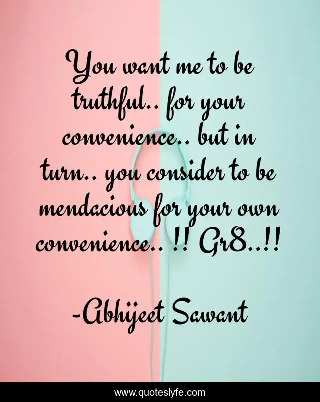 This page presents the quote "You want me to be truthful.. for your convenience.. but in turn.. you consider to be mendacious for your own convenience.. !! Gr8..!!". Author of this quote is Abhijeet Sawant. This quote is about trust, love, truth, affection,.