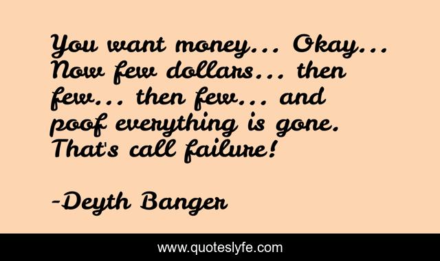 This page presents the quote "You want money... Okay... Now few dollars... then few... then few... and poof everything is gone. That's call failure!". Author of this quote is Deyth Banger. This quote is about failure, dollars, okay, lost, money,.