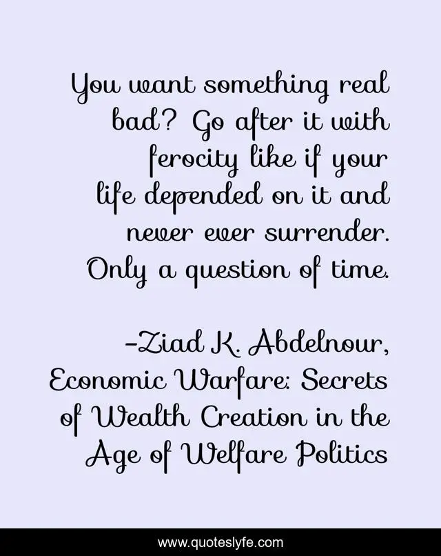 This page presents the quote "You want something real bad? Go after it with ferocity like if your life depended on it and never ever surrender. Only a question of time.". Author of this quote is Ziad K. Abdelnour, Economic Warfare: Secrets of Wealth Creation in the Age of Welfare Politics. This quote is about life, ferocity, surrender, time,.