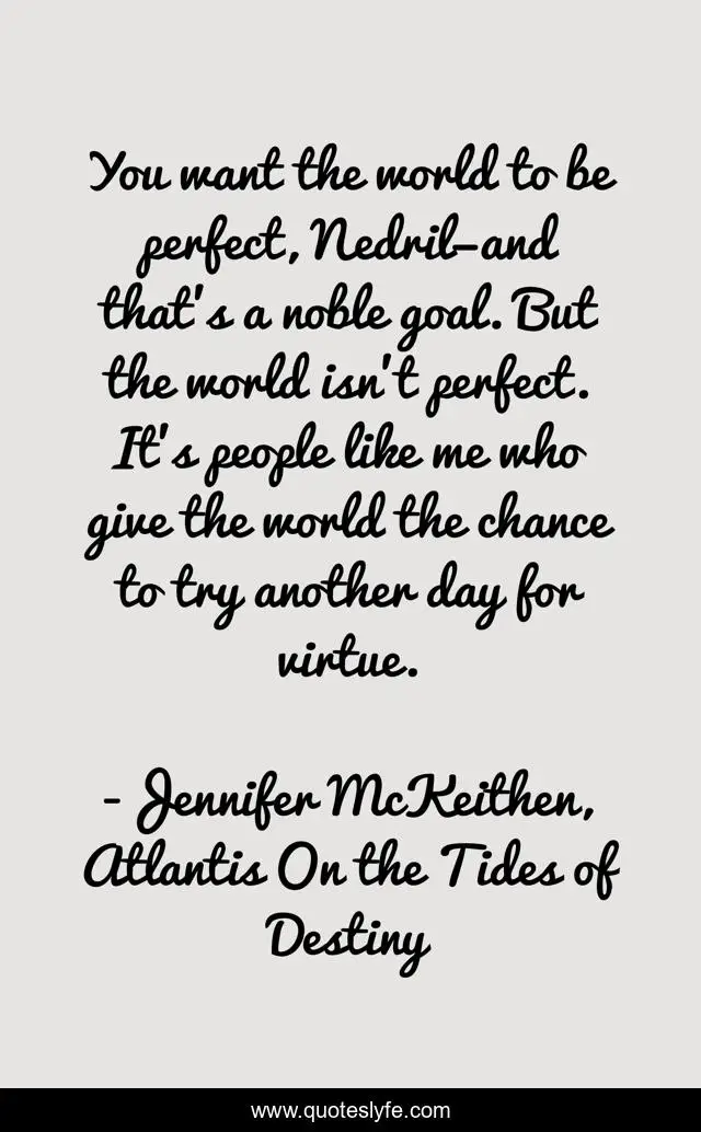 This page presents the quote "You want the world to be perfect, Nedril—and that's a noble goal. But the world isn't perfect. It's people like me who give the world the chance to try another day for virtue.". Author of this quote is Jennifer McKeithen, Atlantis On the Tides of Destiny. This quote is about world-peace, noble-sentiments, atlantis, virtue, dictatorship,.