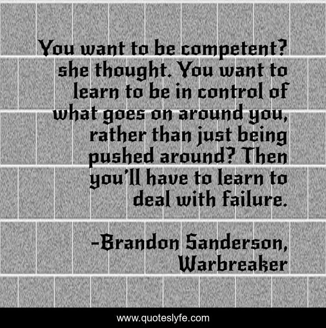 This page presents the quote "You want to be competent? she thought. You want to learn to be in control of what goes on around you, rather than just being pushed around? Then you’ll have to learn to deal with failure.". Author of this quote is Brandon Sanderson, Warbreaker. This quote is about control, failure,.