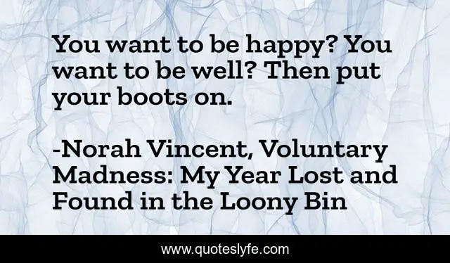 This page presents the quote "You want to be happy? You want to be well? Then put your boots on.". Author of this quote is Norah Vincent, Voluntary Madness: My Year Lost and Found in the Loony Bin. This quote is about psychiatry, enthusiasm, mental-health, psychology, inspirational,.