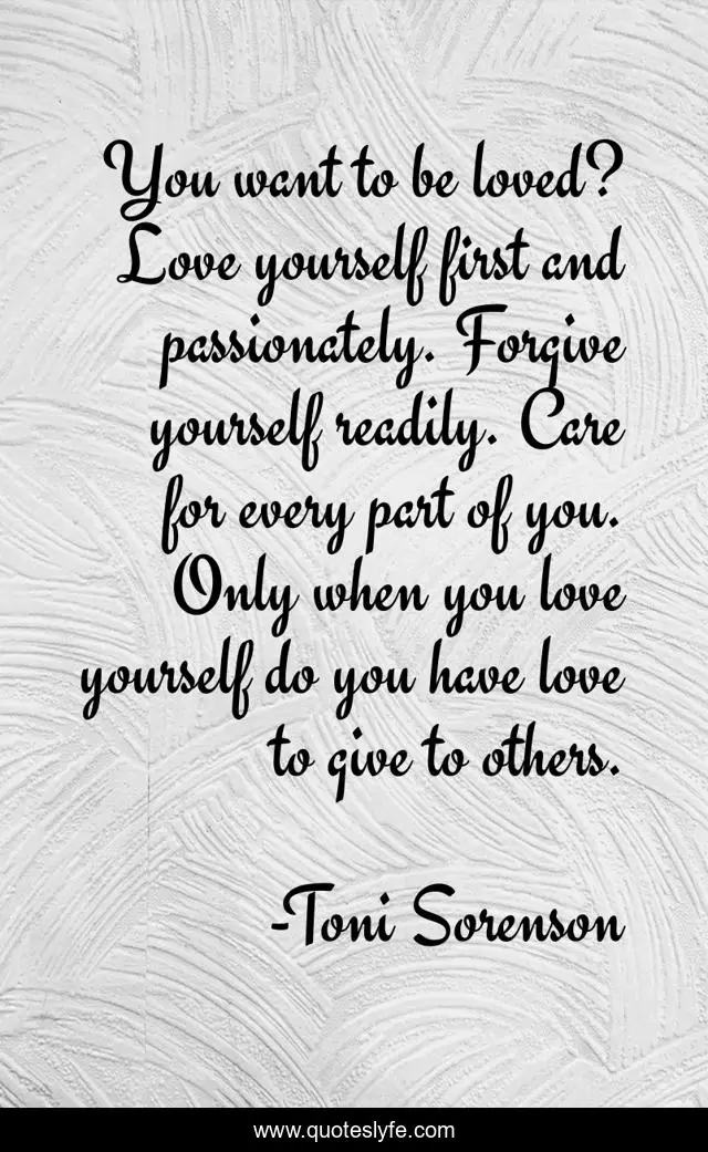 This page presents the quote "You want to be loved? Love yourself first and passionately. Forgive yourself readily. Care for every part of you. Only when you love yourself do you have love to give to others.". Author of this quote is Toni Sorenson. This quote is about self, love, affection, self-worth,.