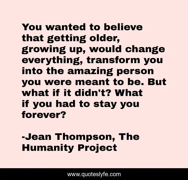 This page presents the quote "You wanted to believe that getting older, growing up, would change everything, transform you into the amazing person you were meant to be. But what if it didn't? What if you had to stay you forever?". Author of this quote is Jean Thompson, The Humanity Project. This quote is about heart, life, destiny, success, self, memory, soul, reality, youth,.
