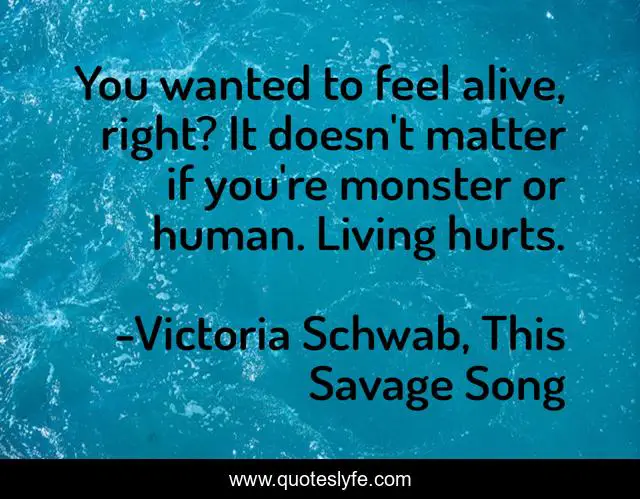 This page presents the quote "You wanted to feel alive, right? It doesn't matter if you're monster or human. Living hurts.". Author of this quote is Victoria Schwab, This Savage Song. This quote is about living, life, pain, human,.