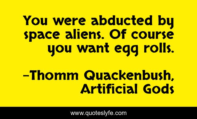 This page presents the quote "You were abducted by space aliens. Of course you want egg rolls.". Author of this quote is Thomm Quackenbush, Artificial Gods. This quote is about chinese-food, abducted, aliens, space,.