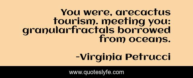 This page presents the quote "You were, arecactus tourism. meeting you: granularfractals borrowed from oceans.". Author of this quote is Virginia Petrucci. This quote is about quotes, love, poetry, affection,.