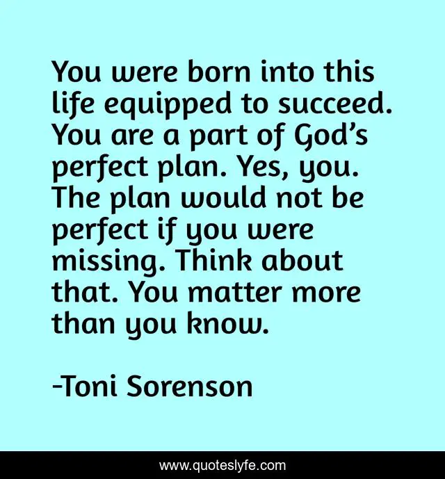 This page presents the quote "You were born into this life equipped to succeed. You are a part of God’s perfect plan. Yes, you. The plan would not be perfect if you were missing. Think about that. You matter more than you know.". Author of this quote is Toni Sorenson. This quote is about faith, life, success, god,.
