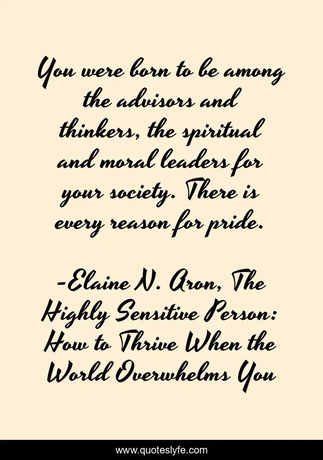 This page presents the quote "You were born to be among the advisors and thinkers, the spiritual and moral leaders for your society. There is every reason for pride.". Author of this quote is Elaine N. Aron, The Highly Sensitive Person: How to Thrive When the World Overwhelms You. This quote is about sensitivity, hsp, gifts, talents, highly-sensitive-person, personality,.