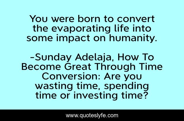 This page presents the quote "You were born to convert the evaporating life into some impact on humanity.". Author of this quote is Sunday Adelaja, How To Become Great Through Time Conversion: Are you wasting time, spending time or investing time?. This quote is about impacts, life, fulfilling-purpose, conversion, productivity, wealth, greatness, waste, humanity,.