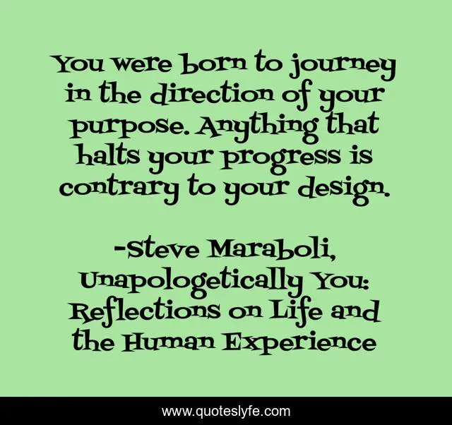 This page presents the quote "You were born to journey in the direction of your purpose. Anything that halts your progress is contrary to your design.". Author of this quote is Steve Maraboli, Unapologetically You: Reflections on Life and the Human Experience. This quote is about direction, success, born, journey, design, purpose, progress, happiness,.