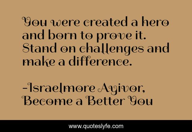 This page presents the quote "You were created a hero and born to prove it. Stand on challenges and make a difference.". Author of this quote is Israelmore Ayivor, Become a Better You. This quote is about motivations, different, inspirations, hero, positive, challenge, motivational, food-for-thought, challenges,.