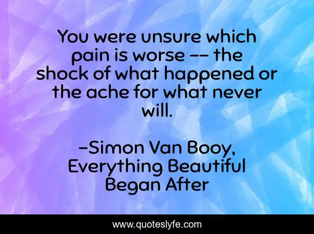 This page presents the quote "You were unsure which pain is worse -- the shock of what happened or the ache for what never will.". Author of this quote is Simon Van Booy, Everything Beautiful Began After. .