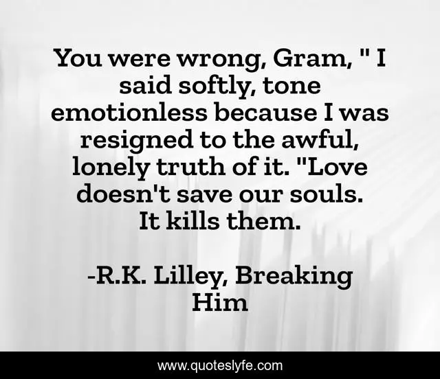 This page presents the quote "You were wrong, Gram, " I said softly, tone emotionless because I was resigned to the awful, lonely truth of it. "Love doesn't save our souls. It kills them.". Author of this quote is R.K. Lilley, Breaking Him. This quote is about death, love, soul, affection,.