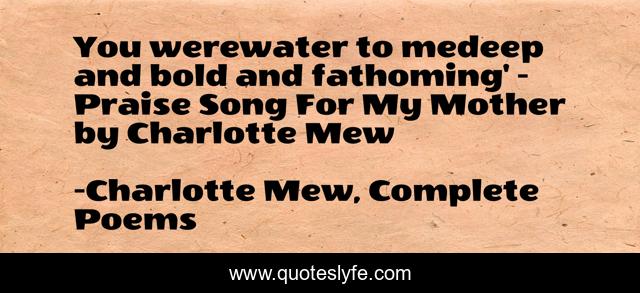 This page presents the quote "You werewater to medeep and bold and fathoming' - Praise Song For My Mother by Charlotte Mew". Author of this quote is Charlotte Mew, Complete Poems. This quote is about poem, charlotte-mew, praise-song-for-my-mother, bold, fathoming, deep, water,.
