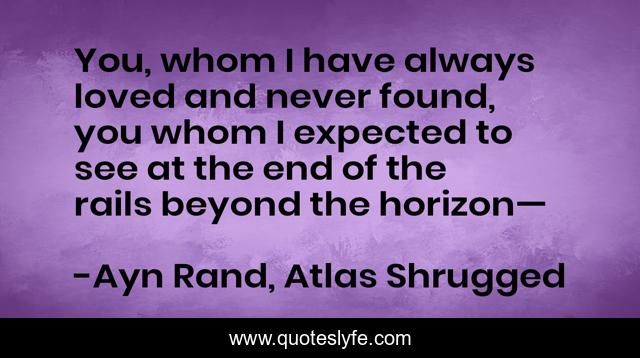 This page presents the quote "You, whom I have always loved and never found, you whom I expected to see at the end of the rails beyond the horizon—". Author of this quote is Ayn Rand, Atlas Shrugged. This quote is about atlantis, idea, memory, love, unattainable, affection,.