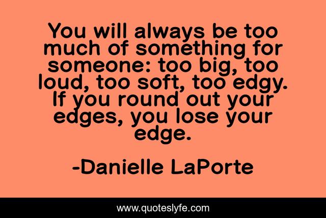 This page presents the quote "You will always be too much of something for someone: too big, too loud, too soft, too edgy. If you round out your edges, you lose your edge.". Author of this quote is Danielle LaPorte. This quote is about someone, loud, big, edge, lose, true,.