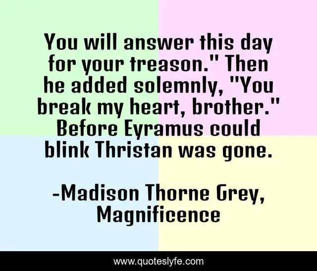 This page presents the quote "You will answer this day for your treason." Then he added solemnly, "You break my heart, brother." Before Eyramus could blink Thristan was gone.". Author of this quote is Madison Thorne Grey, Magnificence. This quote is about fantasy-romance, angels, paranormal-romance, alpha-males, madison-thorne-grey,.