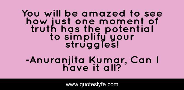 This page presents the quote "You will be amazed to see how just one moment of truth has the potential to simplify your struggles!". Author of this quote is Anuranjita Kumar, Can I have it all?. This quote is about moment-of-truth, potential, struggles,.