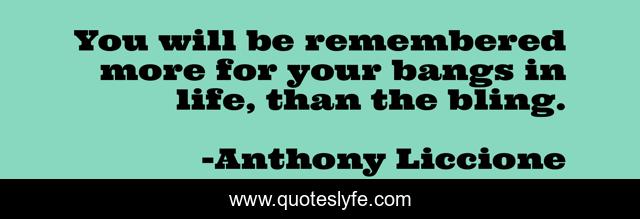 This page presents the quote "You will be remembered more for your bangs in life, than the bling.". Author of this quote is Anthony Liccione. This quote is about bling, lifestyle, hardship, possessions, things, good-life, riches, suffering, materials,.