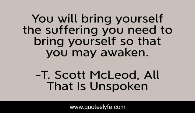 This page presents the quote "You will bring yourself the suffering you need to bring yourself so that you may awaken.". Author of this quote is T. Scott McLeod, All That Is Unspoken. This quote is about spiritual-journey, peace, zen, struggles, awakening, the-end-of-suffering, buddhism, suffering, zen-buddhism,.