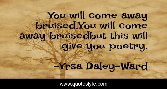 This page presents the quote "You will come away bruised.You will come away bruisedbut this will give you poetry.". Author of this quote is Yrsa Daley-Ward. This quote is about bruised, poetry,.