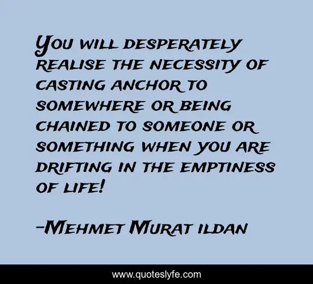 This page presents the quote "You will desperately realise the necessity of casting anchor to somewhere or being chained to someone or something when you are drifting in the emptiness of life!". Author of this quote is Mehmet Murat ildan. This quote is about mehmet-murat-ildan, chained, drifting, needing-someone-s-touch, turkish-writers, turkish-literature, turkish, emptiness, anchoring,.