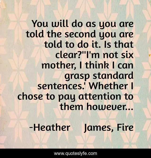 "Heather James, Fire Quotes." Quoteslyfe.com, 2025. Sat. 06 Dec. 2025. <https://www.quoteslyfe.com/quote/You-will-do-as-you-are-told-188656>.