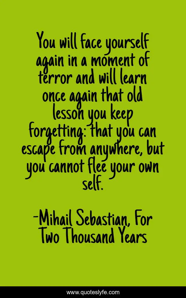 This page presents the quote "You will face yourself again in a moment of terror and will learn once again that old lesson you keep forgetting: that you can escape from anywhere, but you cannot flee your own self.". Author of this quote is Mihail Sebastian, For Two Thousand Years. This quote is about terror, flee, lessons-learnt, yourself,.