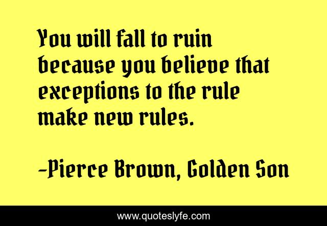 This page presents the quote "You will fall to ruin because you believe that exceptions to the rule make new rules.". Author of this quote is Pierce Brown, Golden Son. This quote is about exceptions, rules,.