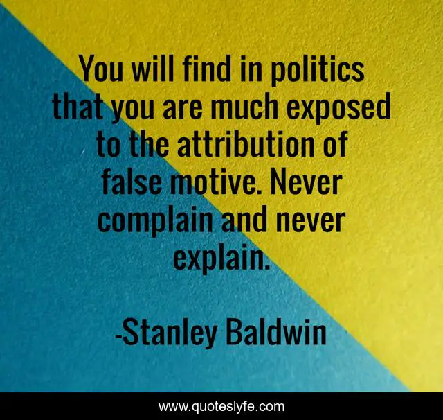This page presents the quote "You will find in politics that you are much exposed to the attribution of false motive. Never complain and never explain.". Author of this quote is Stanley Baldwin. This quote is about explain, find,.